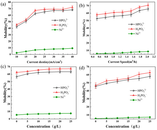 As illustrated in Figure 1a, the mobility of Ni2⁺ ions increased from 2.37% to 9.4% with an increase in current density. Considering the practical circumstances and overall economic efficiency, the optimal current density was determined to be 20 mA/cm2. Figure 1b demonstrates that increasing the current speed gradually enhances the ion mobility, eventually reaching a stable plateau. At a current speed of 1.0 m3/h, ion mobility achieved its maximum stable value, and further increases in the current speed did not lead to significant improvements. Therefore, a current speed of 1.0 m3/h was recommended to maximize phosphite migration efficiency.