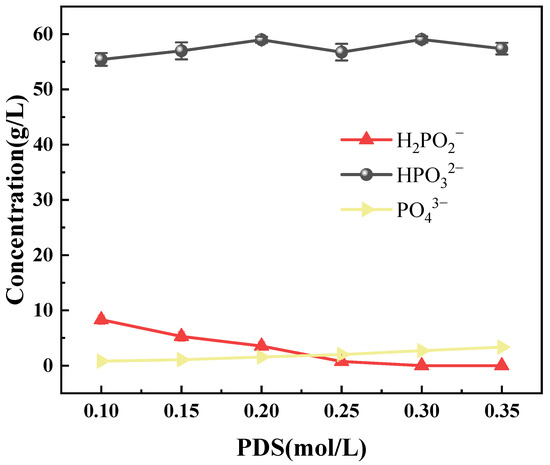 As shown in Figure 3, the oxidation efficiency of hypophosphite increased significantly with the increasing PDS dosage. Specifically, the oxidation efficiency rose from 48.04% to 99.8% when the PDS dosage was increased from 0.1 mol/L to 0.3 mol/L. A further increase in the PDS concentration resulted in negligible improvement, as the hypophosphite was already nearly completely oxidized at 0.3 mol/L. Hence, considering both cost and practical application, a PDS dosage of 0.3 mol/L is recommended for hypophosphite oxidation.