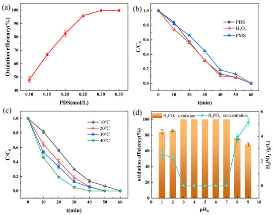 Effects of various reaction parameters on the oxidation efficiency of hypophosphite: ((a) effect of PDS concentration; (b) comparison of different oxidants; (c) effect of reaction temperature; and (d) effect of initial solution pH).