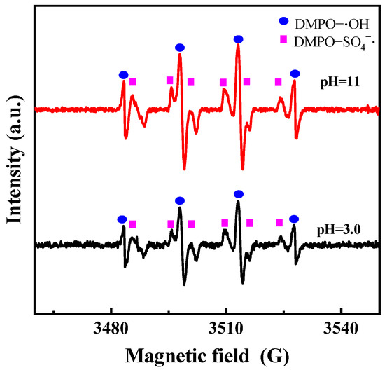 It was observed that solution pH significantly influenced the oxidation mechanism and efficiency of PDS. Electron paramagnetic resonance (EPR) experiments were performed to clarify the radical species involved during the oxidation process at different initial pH conditions (pH₀ = 3.0 and pH₀ = 11), and the results are presented in Figure 5. Signals corresponding to both DMPO–·OH and DMPO–SO4−· adducts were detected in both acidic (pH₀ = 3.0) and alkaline (pH₀ = 11) conditions, indicating the coexistence of SO4−· and ·OH radicals during PDS oxidation. However, under alkaline conditions (pH₀ = 11), a notably stronger signal for DMPO–·OH was detected, suggesting that SO4−· radicals were largely converted to ·OH radicals.