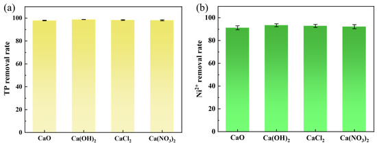 Comparison of ion removal efficiencies using different calcium salts: ((a) TP removal rate; (b) Ni2⁺ removal rate).
