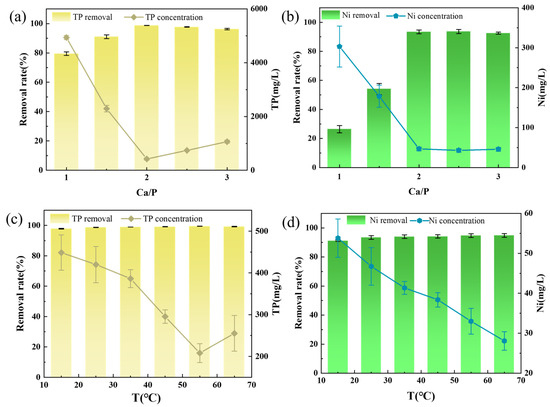 Effect of different parameters on ion removal efficiencies: ((a) effect of Ca/P molar ratio on TP removal rate; (b) effect of Ca/P molar ratio on Ni removal rate; (c) effect of reaction temperature on TP removal rate; and (d) effect of reaction temperature on Ni removal rate).