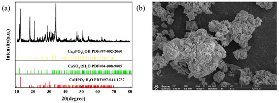 Figure 8 shows XRD patterns and scanning SEM images of the precipitates obtained after phosphorus recovery. The XRD analysis revealed that the precipitated products predominantly consisted of CaHPO3·H2O, along with minor amounts of hydroxyapatite (Ca5(PO4)3OH) and CaSO4·2H2O. Although Ni(OH)2 was theoretically expected to form, it was not detected by XRD, indicating that its concentration in the precipitate was very low. Considering the agricultural importance of phosphorus as a nutrient, the obtained precipitate has potential applications as a phosphorus fertilizer supplement. Additionally, minor impurities such as Ni(OH)2 and CaSO4·2H2O do not necessitate further separation, as they can function as soil conditioners, thus achieving the efficient utilization of recovered phosphorus resources.
