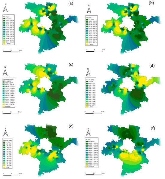 GIS mapping of physical water quality parameters across Delhi–surrounding districts: (a) TDS; (b) TSS; (c) conductivity; (d) turbidity; (e) refractive index; (f) ultrasonic velocity.