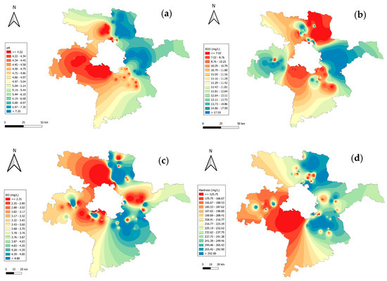 GIS mapping of chemical parameters across Delhi–surrounding districts: (a) pH; (b) BOD; (c) DO; (d) hardness.