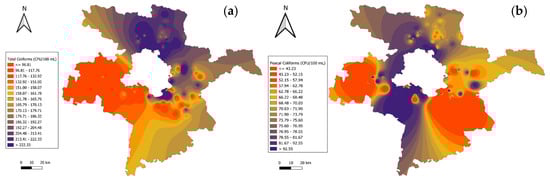 Spatial distribution of microbiological parameters in Delhi–surrounding districts: (a) total coliforms; (b) fecal coliforms.