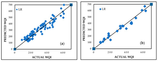 The LR model demonstrated a robust prediction capability for WQI. It was developed using the WEKA 3.8.6 software and is based on the least squares method, which minimizes the sum of squared residuals to estimate the relationship between the independent variables and WQI. The batch size was set to 100, numerical precision was maintained at two decimal places, and default settings for debugging and additional statistics were used to ensure computational efficiency and interpretability. Performance metrics included CC values of 0.9435 and 0.9791, MAE values of 39.7008 and 31.0651, and RMSE values of 48.3181 and 37.8582 for the training and testing datasets, respectively. These results, visualized in Figure 6a,b for the training and testing datasets, respectively, reflect the model’s reliability. Equation (13) presents the derived prediction equation as follows: