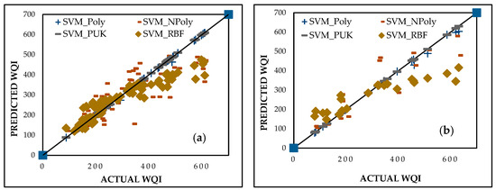 Predicted vs. actual WQI performance for SVM during (a) training and (b) testing stages.