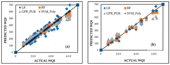 Predicted vs. actual WQI performance for intercomparison models during (a) training and (b) testing stages.