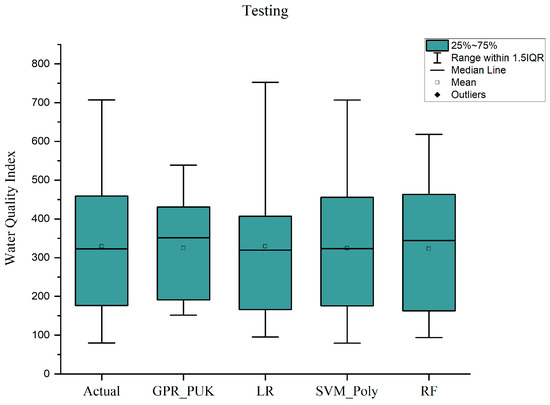 Box plot of actual vs. predicted WQI for testing dataset.