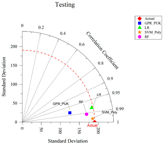 The intercomparison of machine learning models, including linear regression (LR), random forest (RF), GPR_PUK, and SVM_Poly, is summarized in Table 6. The SVM_Poly model demonstrates superior performance, achieving CC values of 0.9975 and 0.9997 for the training and testing datasets, respectively, along with the lowest MAE (1.4494 and 5.6085, respectively) and RMSE (21.7967 and 11.4158, respectively). RF follows as a strong contender, with CC values of 0.9963 and 0.9925, respectively, and a relatively low MAE (10.2745 and 21.7398, respectively) and RMSE (15.4521 and 29.8107, respectively). RF and GPR_PUK also deliver robust results, but their accuracy metrics are marginally lower than SVM_Poly. LR shows reliable performance but with higher deviations in predicted values.