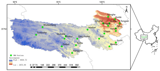 Study area and the locations of meteorological observation stations. The Sanjiangyuan region is located in the Qinghai-Tibet Plateau in western China, where 21 CMA meteorological observation stations are used to verify the quality of the assimilation data.