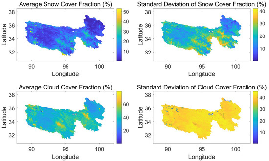 The joint quality control scheme is applied to the snow depth data converted from MODIS SCF data. Due to the high cloud cover fraction in high-altitude areas (Figure 2) and the large sensitivity of snow depth to precipitation [25], we employ a quality control before data assimilation. Specifically, when the MODIS cloud cover at a grid point is less than or equal to 5%, and the change in snow depth between two days does not exceed 10 times of the change in total precipitation, the snow depth data converted from the MODIS SCF satellite data at that grid point will be assimilated. Otherwise, no assimilation is performed. In addition, if the SCF or cloud cover fraction of a grid point is missing, assimilation will not be performed on that day.