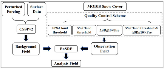 The construction of CSSPv2-SDA system. ∆SD refers to snow depth change and Pre refers to total precipitation between two consecutive timesteps. The assimilation system is based on the CSSPv2 land surface hydrological model and the EnSRF assimilation algorithm. It generates the background field by perturbing meteorological forcing data, performs quality control on MODIS satellite remote sensing data to generate the observation field, and applies the EnSRF method to generate the analysis field.