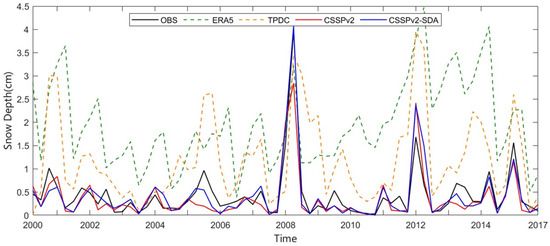 Figure 4 depicts the observed and simulated winter (November–February) snow depth averaged over 21 stations during 2000–2015. Both the ERA5 and TPDC products overestimate the winter snow depth in the Sanjiangyuan region, with the root-mean-squared-error (RMSE) being 1.08~1.74 cm. Compared to the ERA5 and TPDC, the CSSPv2 simulation is much closer to the observations and captures the peaks and valleys quite well, leading to a small RMSE (0.27 cm). In addition, the CSSPv2 simulation also shows priorities in capturing annual variations of snow depth, by increasing the correlation coefficient (CC) from 0.37~0.57 of ERA5/TPDC to 0.88. The advantages of CSSPv2 simulation are attributed to both a high-quality precipitation forcing and the physical parameterizations (e.g., five-layers snow module) [13].