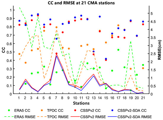 Validation of CSSPv2-SDA product at station scale. The CC and RMSE of the 21 CMA stations are represented by dots and lines, respectively.