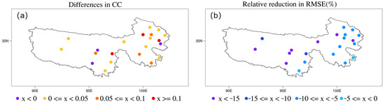 After assimilating MODIS snow cover fraction data into the model, the simulation result (CSSPv2-SDA) is further improved in both average and station scales. Specifically, CSSPv2-SDA increases the snow depth when the CSSPv2 model-simulated snow depth is underestimated (such as in November 2005 and January 2008) and reduces the RMSE to 0.22 cm (about 18.5% smaller than that of CSSPv2 model simulation). The interannual variations of snow depth in CSSPv2-SDA are also closer to the observation, resulting in a 5.6% larger CC than CSSPv2. Similarly, the assimilation system has mostly improved the simulation of individual stations. Figure 6a,b show the spatial distribution of added value of snow data assimilation at station scales. For most stations, the CC increases by 0.05–0.1 (Figure 6a), and the RMSE decreases by 5–19% (Figure 6b).