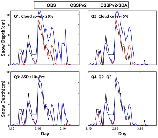 Evaluation of quality control scheme. Time series of observed, simulated, and assimilated snow depth at station 56034 during a snowfall event in 2012 are shown, with four different quality control schemes. Q1 uses the cloud cover threshold of 20%, and Q2 uses 5%. Q3 requires snow depth assimilation increment should be less than 10 times the precipitation amount, and Q4 is the combination of Q2 and Q3.