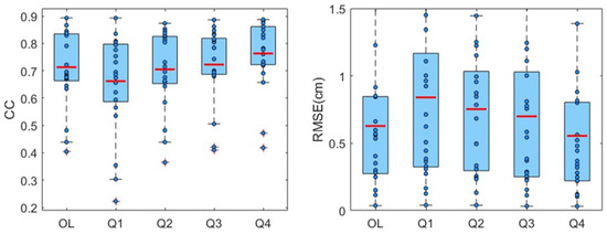 CC and RMSE for CSSPv2 open-loop simulation (OL) and data assimilation with 4 quality control schemes (Q1–Q4) at the 21 observation stations. The dots represent the CC or RMSE values for each station, while the red lines indicate the average values of CC or RMSE.
