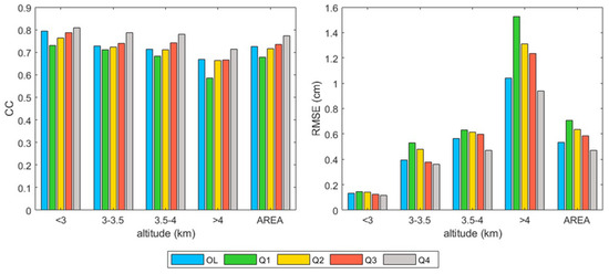 CC and RMSE for CSSPv2 simulation (OL) and data assimilation with four different quality control schemes (Q1–O4) for the whole area and four altitude ranges.