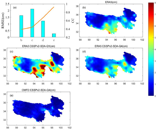 Figure 11 shows the impact of the quality control schemes and different forcing data. The performances of CSSPv2-SDA system using different quality control schemes and different forcing data are shown in Figure 11a. The station average CC of ERA5 is 0.37 and the RMSE of ERA5 is 1.74 cm (Figure 11b). Under the quality control scheme with a 20% cloud cover threshold, the assimilated snow depth (Figure 11c) has a CC that increased to 0.44, but the RMSE rises to 2.12 cm, indicating that using an inappropriate quality control scheme may actually reduce the accuracy of the simulation. When the quality control scheme combining a 5% threshold with precipitation restriction is applied (Figure 11d), the CC increases to 0.67, and the RMSE decreases to 1.22 cm. This set of assimilated data is inferior to the assimilated data driven by CMFD (Figure 11e), which has a CC of 0.93 and a RMSE of 0.22 cm. Comparing each set of data, the newly proposed quality control scheme has an average accuracy improvement of 47% over traditional quality control schemes; CMFD forcing data have an average improvement of 58% over ERA5 forcing data (Figure 11a).