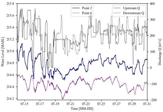 Previous work has been done in the river where the depth was measured from June–September 2021 with six pressure loggers together with an real-time kinematic (RTK) GPS pole to obtain the height elevation of the pressure loggers [24]. Combining the depth and elevation, the water surface elevation (WSE) can be obtained. The pressure logger locations are seen in Figure 1. The WSE from measurement points 2 and 6 is presented in Figure 2, with upstream and downstream discharge provided by Vattenfall, AB (Figure 2).