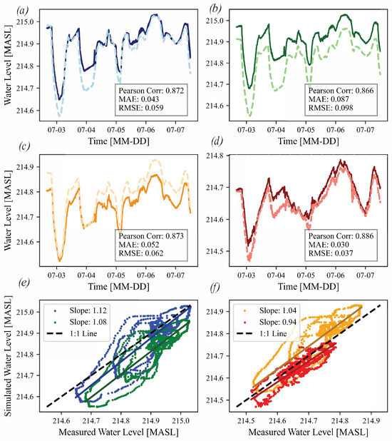 The roughness values for the two cases are quite similar. The mean value between the two flows was chosen, and the roughness was linearly increased or decreased between the computational domains. With the calibrated roughness, the model was simulated between 2 and 7 July to evaluate its performance. The simulated and measured water levels were compared at four points, as shown in Figure 5a–d. Figure 5e,f, which include scatterplots illustrating the measured values fitted against the simulated values over time.