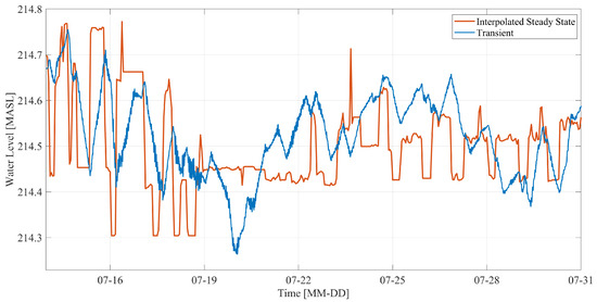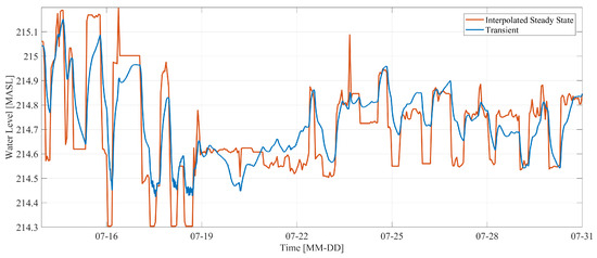 Further downstream at measurement Point 5 (Figure 7), greater deviations in the pattern can be seen between the transient simulation and the steady-state interpolation. The MAE between the curves was 0.088 m, similar to point 2, and the maximum absolute error was only 0.31 m. The difference between the methods can be explained by the neglect of backwater effects and loss of dampening in the steady-state approach. Since the steady-state interpolation assumes an immediate response between the defined discharge conditions, it fails to capture the progressive change in water level variations that occur in the dynamical flow. Furthermore, downstream regulation influences the WSE, and the steady-state approach does not always capture how these effects alter the water levels. In contrast, the transient simulation models these unsteady flow processes, leading to a more accurate representation of downstream WSE over time.