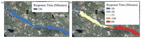 Response time. (a) Steady-state interpolated. (b) Transient simulation (Orthophoto, ©Lantmäteriet).
