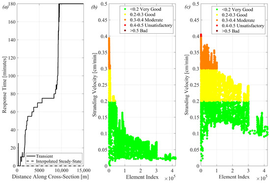 (a) Response time longitudinal cross-section. (b) Stranding velocity for transient simulation. (c) Stranding velocity for the steady-state interpolation.