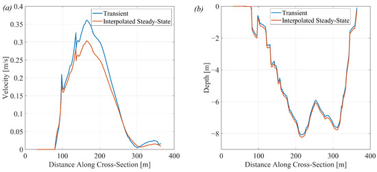 The depth and velocity was compared by extracting the variables on 19 July, when the water levels were lowest during the time period. There was a significant difference between the two simulation methods. The values were extracted at the cross section located furthest downstream in Figure 1, which is the most narrow section of the river reach downstream. The maximum depth difference in the chosen time step and cross section was 0.15 m, and the velocity difference was 0.06 m/s (Figure 10). The velocity and depth across all elements and time steps were used to find spawning areas according to the preferred depths and velocities of European grayling [24,30]. The total spawning area observed over time is presented in Figure 11. The spawning area differs over time, where the interpolated steady-state fails to show the variation that occurs daily.