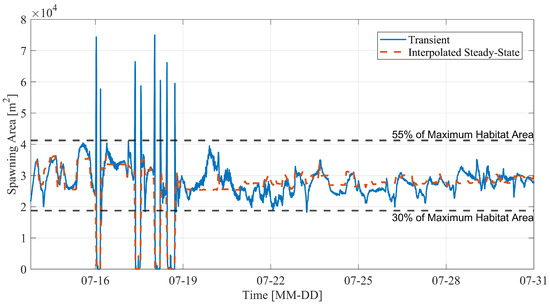 In rivers with stable flow conditions, steady-state interpolation can serve as a useful tool to reduce simulation time and evaluate new operational flow strategies for habitat improvement. In this study, the steady-state interpolation approach resulted in a MAE of 2910 m2 in estimating spawning habitat area. Although this time period had relatively stable conditions considering the annual variation in reservoir water levels, steady-state interpolation seems unsuitable for this river during any time of the year.