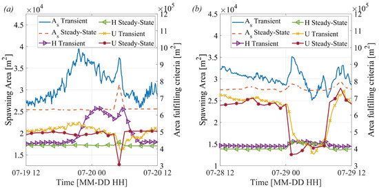 Spawning area, As, and area fulfilling the spawning criteria for depth, H, and velocities, U, over time: (a) 19–20 July, (b) 28–29 July.