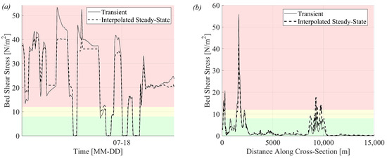 The bed shear stress for both the transient and steady-state simulations were estimated using Equations (8) and (9). The differences between the methods include how the bed shear stress is obtained over time. In the steady-state approach, the bed shear stress is linearly interpolated from the seven uniform flow cases to estimate its variation over time. In contrast, the transient simulation directly calculates the bed shear stress at each time step based on the time-dependent velocity and hydraulic radius, capturing real-time variations for the dynamic flow. The bed shear stress was plotted for one element over time (Figure 13a) in a spawning area upstream, close to the outlet of the hydropower plant, and for a longitudinal cross section (Figure 13b) following the main stream to display differences in up- and downstream estimations.