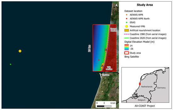 Wave-climate datasets derived from global and regional wave models were collected for the IJmuiden area to assess the impact of different data sources on the model results. The datasets used include in situ data Measured-YM6, reanalysis data from the global ERA5 model [38] and hindcast simulations from the regional AENWS-WPR model [39]. Measured-YM6 wave-climate data were collected from an offshore station located 26 km from the IJmuiden coast, at a depth of 21 m (52.55° N, 4.06° E, water depth ≈ 25 m to MSL) [23]. The ERA5 dataset corresponds to an area of 0.25° × 0.25°, represented by its central point, located near to the initial measurement site, Measured-YM6 (ERA5: 52.50° N, 4.00° E), while the AENWS-WPR model provided wave-climate data for Measured-YM6 (52.55° N, 4.06° E) and one additional nearshore location north (AENWS-WPR North) of IJmuiden (52.51° N, 4.55° E) [32]. The positions of these datasets are illustrated in Figure 1, and significant wave height, peak wave period, and the direction for each dataset are presented in Figure 4.