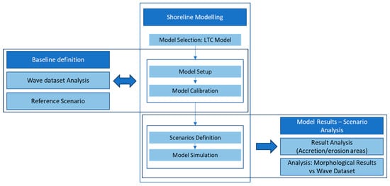 The methodology developed in this work is based on three main phases (Figure 3): (i) Baseline definition, which includes a wave dataset analysis, a shoreline reference scenario definition and evaluation; (ii) shoreline modelling and evolution projection in a medium-term horizon applying LTC (Long-Term Configuration) numerical model [2]; and (iii) the model results—a coastline evaluation analysis for each scenario (12 scenarios) and morphological results vs. wave dataset analysis. The methodology is described in the following sections.