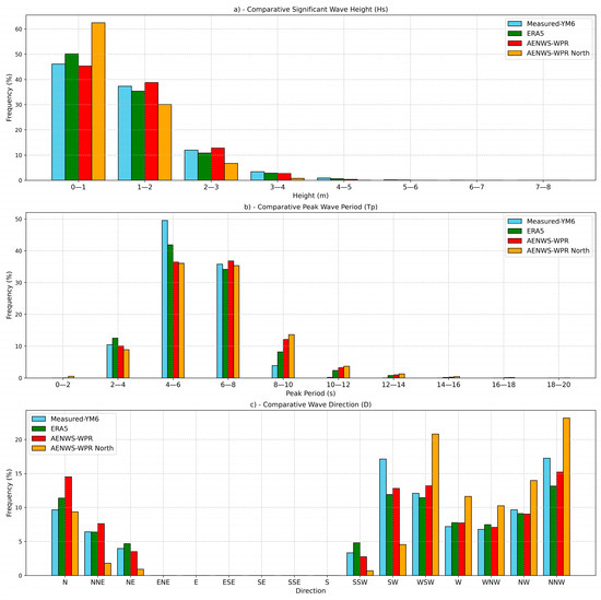 The distribution of peak wave periods reveals that most waves fall within the 4–8 s range, with the 4–6 s interval being the most prevalent across all datasets. The Measured-YM6 dataset (blue) exhibits the highest frequency in this range, followed closely by ERA5 (green). As the peak wave period extends beyond 8 s, the frequency of occurrence drops significantly, indicating that longer peak wave periods are generally less common in the recorded data. However, it is notable that the reanalysis datasets, show a higher frequency of peak wave periods, exceeding 8 s when compared to the Measured-YM6 (blue).