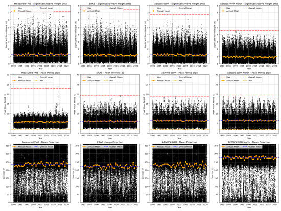 The wave-climate data used were from the Measured-YM6 dataset, covering the period from 1980 to 2020 (with the full time series available from 1971 to 2022), as well as three reanalysis datasets: one from global ERA5 model [38] and two hindcast simulations, from the regional AENWS-WPR model [39] (one point near Measured-YM6 and the other close to the coast); see Figure 6.