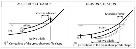 The model assumes that = , meaning that the volume variation in sediments () over the length () is uniformly distributed across the active cross-shore profile, representing an elevation variation () at each time step, as shown in Equation (3) and Figure 7 [2]. The active profile is adjusted with adjacent areas; therefore, the shoreline position depends not only on but also on the bathymetry and topography associated with each cross-shore profile (Figure 7). Thus, the LTC model computes a new cross-shore profile shape at each time step [2,47].
