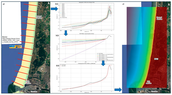 (a) Bathymetry and topography provided by EMODnet; (b1) profiles extracted from EMODnet dataset; (b2) Dean’s profile bathymetry adjustment to the mean profile; (b3) Dean’s profile generation; and (c) bathymetry and topography generated for modelling.
