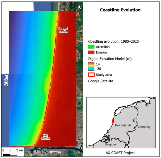 Coastal erosion is a significant challenge within the study area, requiring a comprehensive understanding of sediment dynamics, including wave datasets, sediment erosion and accretion rates, and model calibration and validation. The proposed methodology was developed as part of the AX-COAST project, which aims to enhance the COAST tool—an innovative solution for cost–benefit analysis of coastal interventions [50]. COAST is an integrated tool for this type of evaluation, combining three modules: Coastal Evolution Module; Coastal Defense Structure Pre-Design Module; and Cost–Benefit Module [11,51,52,53].