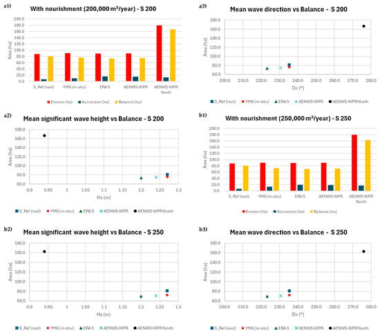 The analysis of the 200,000 m3/year (Figure 10(a1)) nourishment scenario reveals similar trends in erosion, accretion, and net balance. Erosion, represented by red bars, shows consistent levels across datasets, such as S_Ref, Measured-YM6, ERA5, and AENWS-WPR. However, a significant increase in erosion is observed in the AENWS-WPR North scenario, highlighting the sensitivity of these models to the wave-climate dataset. Accretion, depicted by blue bars, remains marginal across all datasets, indicating minimal sediment deposition regardless of the dataset employed. As expected from the erosion and accretion results, the net balance, represented by yellow bars, is similar for the first three datasets (Measured-YM6, ERA5, and AENWS-WPR), but exhibits a substantial increase in the AENWS-WPR North scenario.