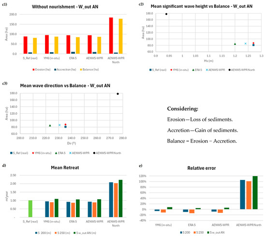 The relative error in AENWS-WPR North remains consistent across the nourishment scenarios (S 200, S 250, and W_out AN), indicating that the error is dataset-dependent. In Measured-YM6, AENWS-WPR and ERA5, the 250,000 m3/year (S 250) scenario shows slightly higher negative errors compared to the 200,000 m3/year (S 200) scenario, reflecting the effect of an increase in nourishment volume. Without nourishment (W_out AN), relative error variations increase, indicating greater erosion, except in AENWS-WPR North, which continues to exhibit poor performance.