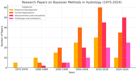 - Articles were organised into histograms reflecting historical development, current applications, advancements and innovations, and challenges in Bayesian hydrology.