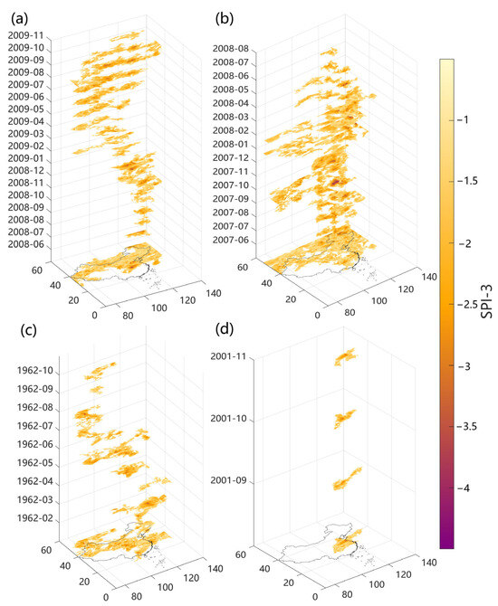 Three-dimensional visualization of typical drought events. The 2008/06–2009/11 event (a); the 2007/06–2008/05 event (b); the 1962/02–1962/10 event (c); and the 2001/09–2001/11 event (d). The base map displays the two-dimensional projection of all drought patches across the study area throughout each event. The vertical axis represents time (months), while color intensity indicates drought severity.