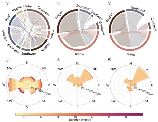 (a–c) shows the migration of drought events between nine major river basins in China, with directional lines pointing from the occurrence area of drought events to the end area, the color of the line is consistent with the color of the event occurrence area, and the thickness of the line indicates the number of migrating events of the same type. (d–f) are the statistics of the migration direction of drought events, and the color of the fan represents the distribution of the duration of events in that direction.