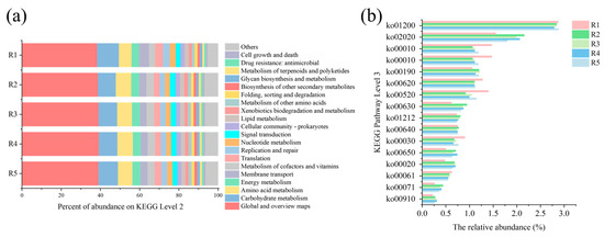 The relative abundances of (a) enriched KEGG Level 2 pathways and (b) enriched KEGG Level 3 pathways in Stage II.