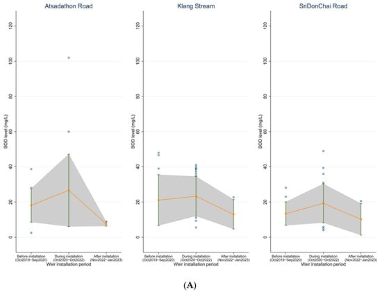 BOD and DO levels were measured monthly from October 2019 to January 2023. The averages and ranges of levels at each location are provided in Table 3. The average BOD level at SriDonChai Road was the lowest (16.83 (range: 4.00–49.00) mg/L). Meanwhile, the average DO levels at Atsadathon Road and SriDonChai Road were similar (1.73 (range: 0.00–6.50) and 1.58 (range: 0.00–9.50) mg/L, respectively), and higher than those in the Klang Stream.