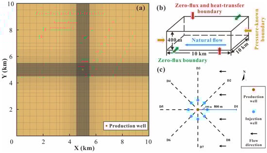 - Boundary conditionThe reservoir of the Minghuazhen Formation in the study area is a confined aquifer, and the heat transfer between the target reservoir and the surrounding rock is calculated by the semi-analytical solution to improve the calculation efficiency.The natural groundwater flows from northeast to southwest, the corresponding lateral boundaries (X= 10 km and X = 0 m) are set as constant pressure, and because the range of the numerical simulation area is large enough, the production and injection well cannot cause the change in temperature and pressure at the boundary of the target reservoir. The boundaries (Y = 10 km and Y = 0 m) along the northwest to southeast direction are considered impermeable, resulting in no groundwater flow across them. The boundary conditions of this study area are shown in Figure 2b.