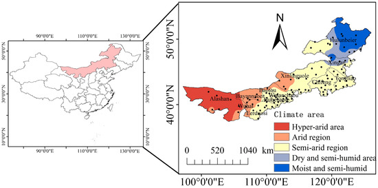 Meteorological data were obtained from the China Meteorological Data Network (https://data.cma.cn/site/index.html; accessed on 6 Decembe 2022) and the Irrigation Area Water Use Information Monitoring Platform (www.etspatial.com; accessed on 17 April 2022), primarily encompassing 107 meteorological stations located within Inner Mongolia. The meteorological elements included daily rainfall, average temperature, maximum and minimum temperature, wind speed, and sunshine duration data spanning from 1961 to 2020. These daily scale data were processed to obtain monthly scale data. For individual missing test datapoints, the average value of the past 5 years was used as a substitute. The aridity index (ratio of evapotranspiration to precipitation) was used to partition the climate of the Inner Mongolia region [23]. According to the zoning standards, Inner Mongolia was categorized into hyper-arid (Region I), arid (Region II), semi-arid (Region III), dry and semi-humid (Region IV), and moist and semi-humid (Region V) climate regions. The hyper-arid climate region is mainly in the western part of Inner Mongolia; the arid climate region is mainly in the central and western parts of Inner Mongolia; the semi-arid climate region is mainly in the central and eastern parts of Inner Mongolia; the dry and semi-humid climate region is mainly in the hilly areas of northeastern Inner Mongolia; and the moist and semi-humid climate region is mainly in the northeastern part of Inner Mongolia. The spring maize yield data were mainly obtained from local statistical yearbooks. The study area is shown in Figure 1.